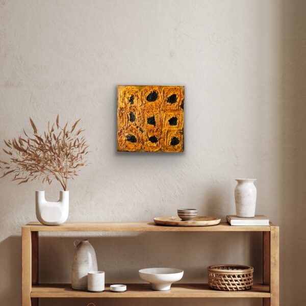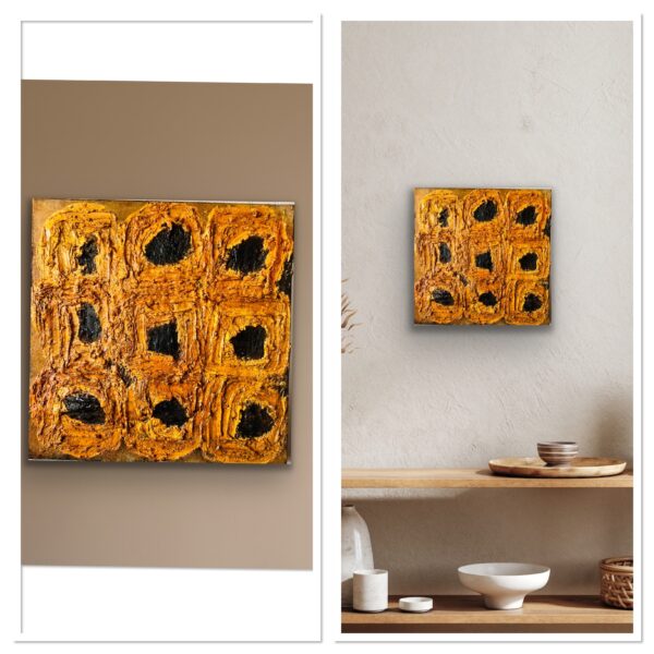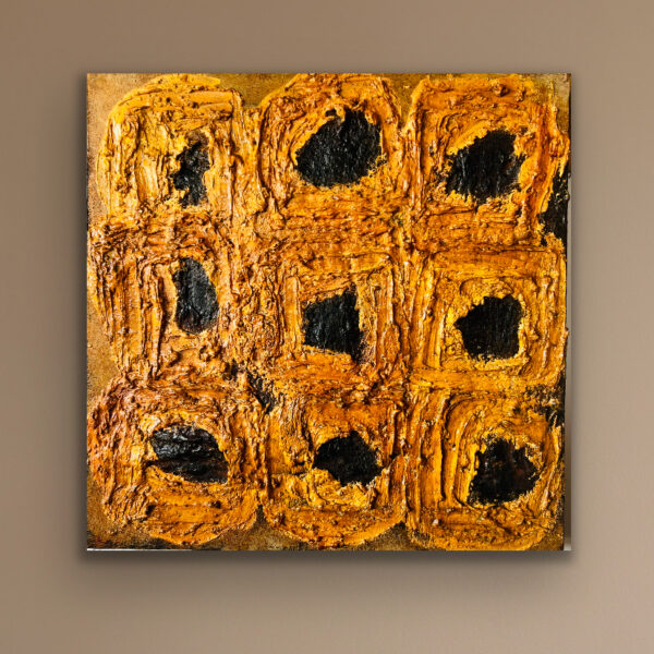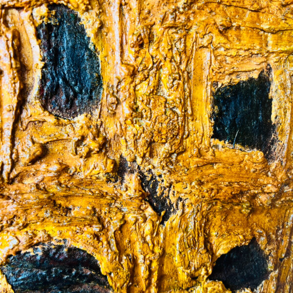 Sunflowers grow wild on the Kansas plains and are one of the last flowers to bloom in late summer. Their vibrant color ushers the land into the early half of autumn. They are the state flower of Kansas since 1903. When growing, the flowers and leaves follow the path of the sun. This heavily textured painting is made of layers of stone with paint, burnt prairie sage, and rust. The yellow petals are colored with three layers of botantical inks.