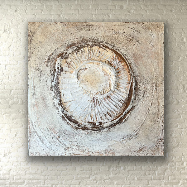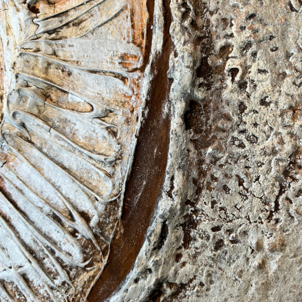 Made at the time of Saint Bridget’s day, which is the traditional start of spring in the old world. It’s the moment where you get the hint that the land is turning a corner. On the Prairie, winter is necessary to scarify the seeds of wild plants, so that they may grow again when warmth returns. This chipping away of the seed in the harsh conditions cannot be avoided if the plant wishes to take root. At Saint Brigid’s day, we sense that change is coming though, and soon the land will shed her cold mantle and face the sun. My rendition of the winter bones of a wild sunflower has paint with thick stone texture, rust, snow, wild plant ash and embedded grain.