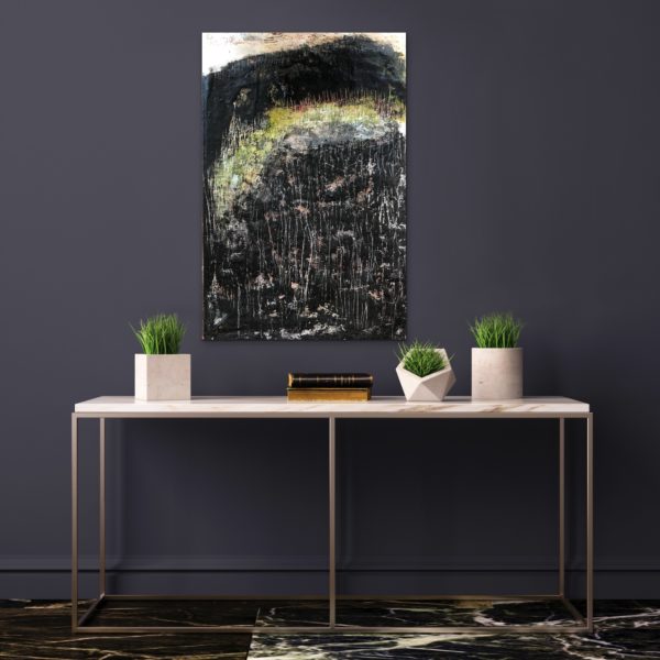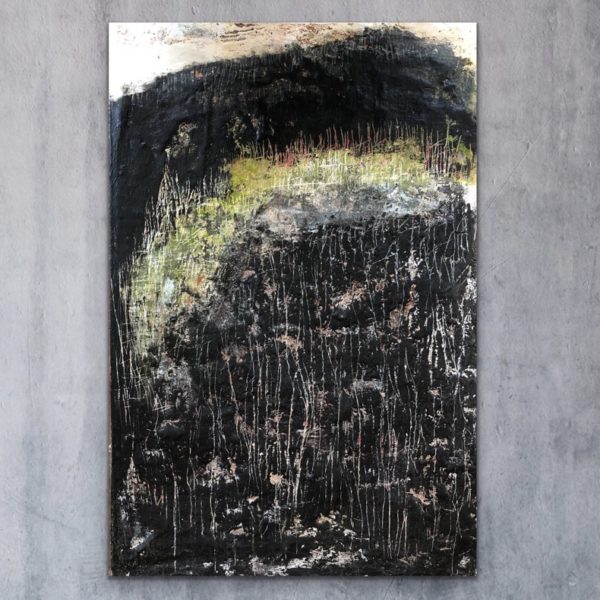 In the spring, plains ranchers burn off last year’s tall grass to clear the pasture, in doing so the Earth releases the old and makes way for something new. Within days, bright growth rises above the charred earth and the world grows again. Created with stone, embedded Kansas grain, tarry earth pigments, rust and paint.