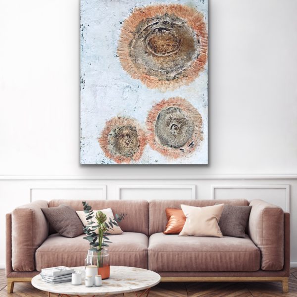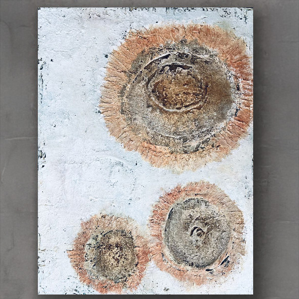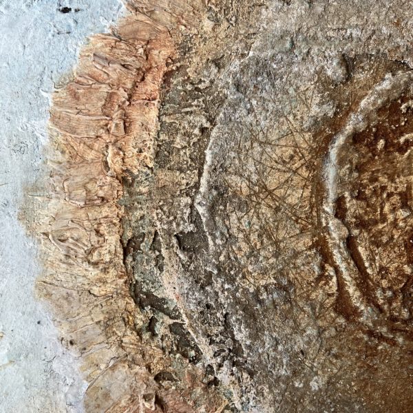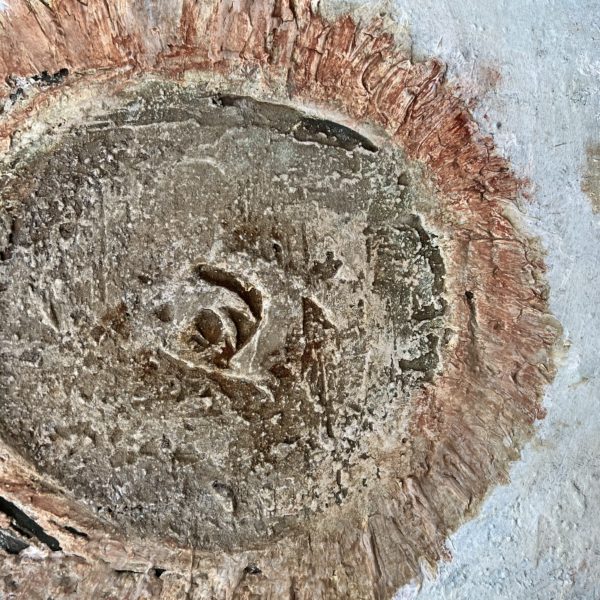 I love the ancient feel of these flowers, born of land and time. They contain the silt of the Smoky Hill river which tells the story of this place as it slowly meanders across plains collecting detritus. The piece is eroded with limestone and has stone texture, rust, sagewort ash, red earth pigment, and paint.