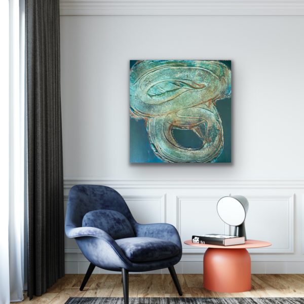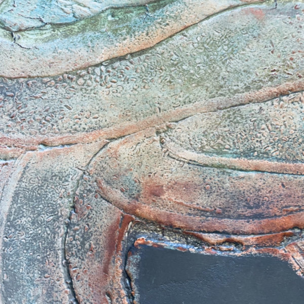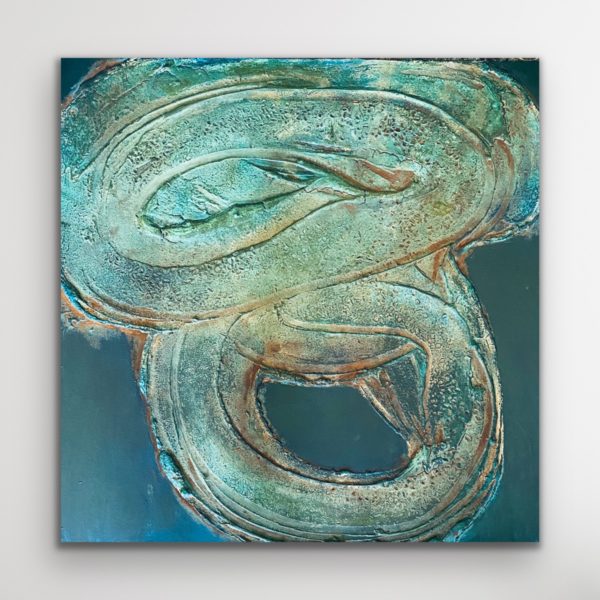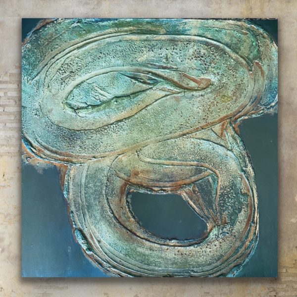 This painting points to the the mystery of deep water and serpentine eddies, symbols of creative life force, created with paint, stone texture, grain and rust. Serpents are one of the oldest and widespread mythological symbols, often representing rebirth and the shedding of old ways.