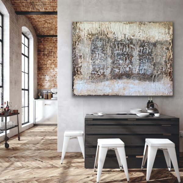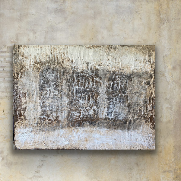 Wander through a country field deep with snow and you find the haunting stillness of a new world revealed. Senses are heightened to discover what was once invisible… tracks of the cottontail, keening of a prairie hawk, the wind talking to old leaves. Created with stone, Kansas salt, Smoky Hill river silt, limestone, prairie plant ash, eroded sandstone, field quartz, rainwater and paint.