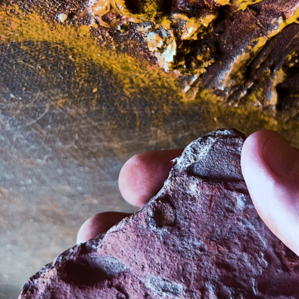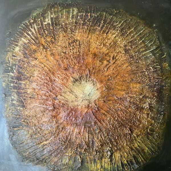 Nature is most beautiful as things are about to leave. The long shadow of autumn reveals that the colors of the prairie are at their brightest just before they fade. The circular form at the heart of the painting presents the cycle of life and death, growth and decay. I made radiating lines to evoke the veins of wild plants, now beginning to fold inward. The texture speaks to the roughness of change and the way that time wears on beauty, but does not diminish its grace. Made with grain, stone, rust, plant ash, and paint.